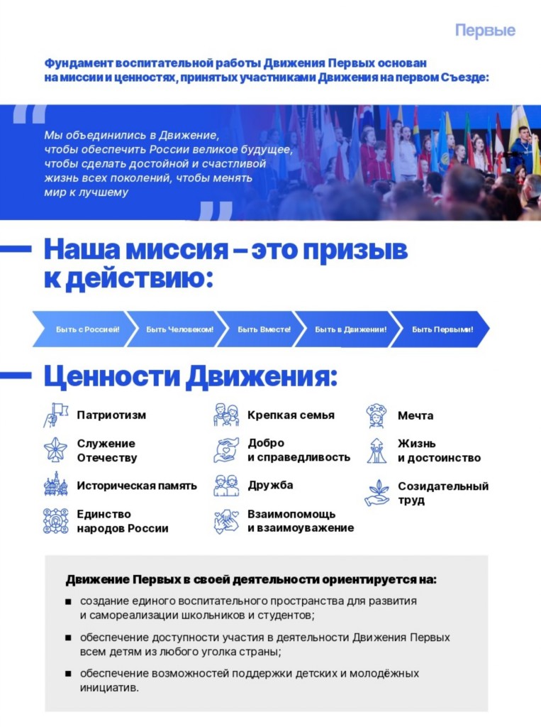 Это возможность стать лучшей версией себя, достойным наследником великих дел первооткрывателей, основателей и первопроходцев, которых отличает стремление к победе во всех начинаниях и нежелание останавливаться на достигнутом. Быть участником Движения – это выбор сильных и готовых вписать свое имя в историю России.